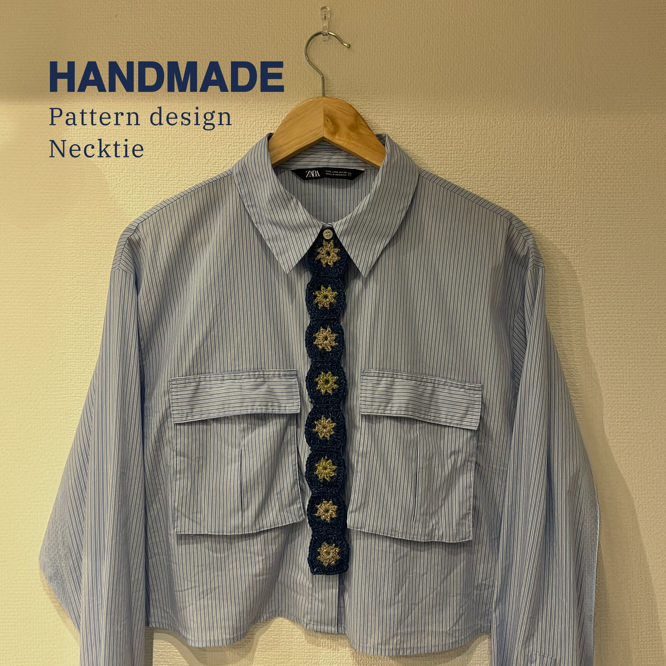 雫が地に着いた時に弾けた姿を四角いモチーフに表現し、それらを繋げてネクタイにしました。 青いシャツによく似合い、梅雨時にも合うデザインになっております。